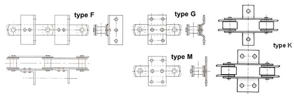 o attaches K à un ou plusieurs trous qui forment un plan de fixation perpendiculaire aux plaques avec choix de trois valeurs d'entraxe de trous (K2 à entraxe court, moyen et long), la largeur des attaches variant en conséquence. Ces attaches sont réalisables sur les maillons intérieurs, extérieurs, d'un côté ou des deux, selon une fréquence et une disposition à préciser à la commande.